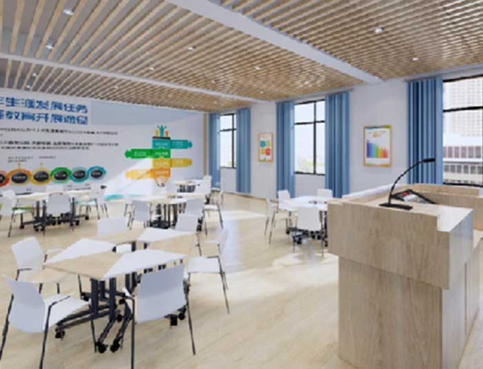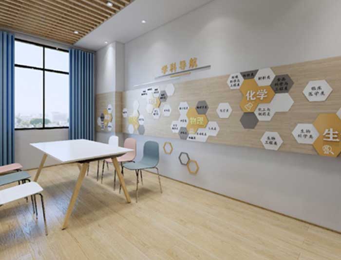 以“学生发展指导中心”为中心,设计五大空间围绕着学生发展指导中心,五大空间分别是生涯空间建设、学业空间建设、心理空间建设、理想空间建设、生活空间建设。学生发展指导中心是学校开展指导工作的外在载体,在此可进行关于生涯指导、生活、学业、理想、心理的信息知识宣传,也可开展相关的课程。